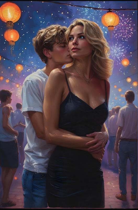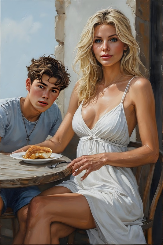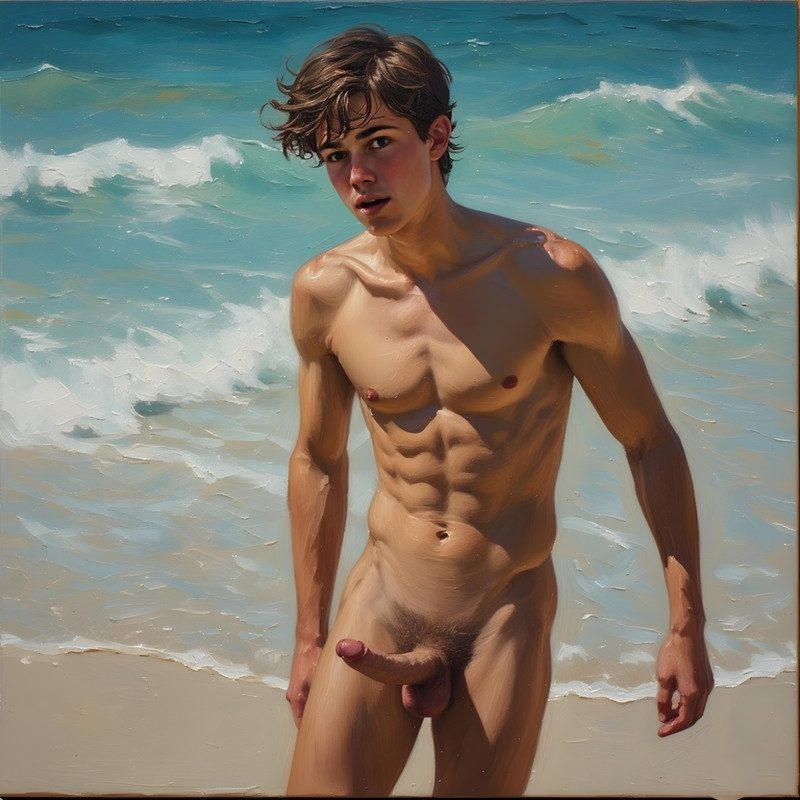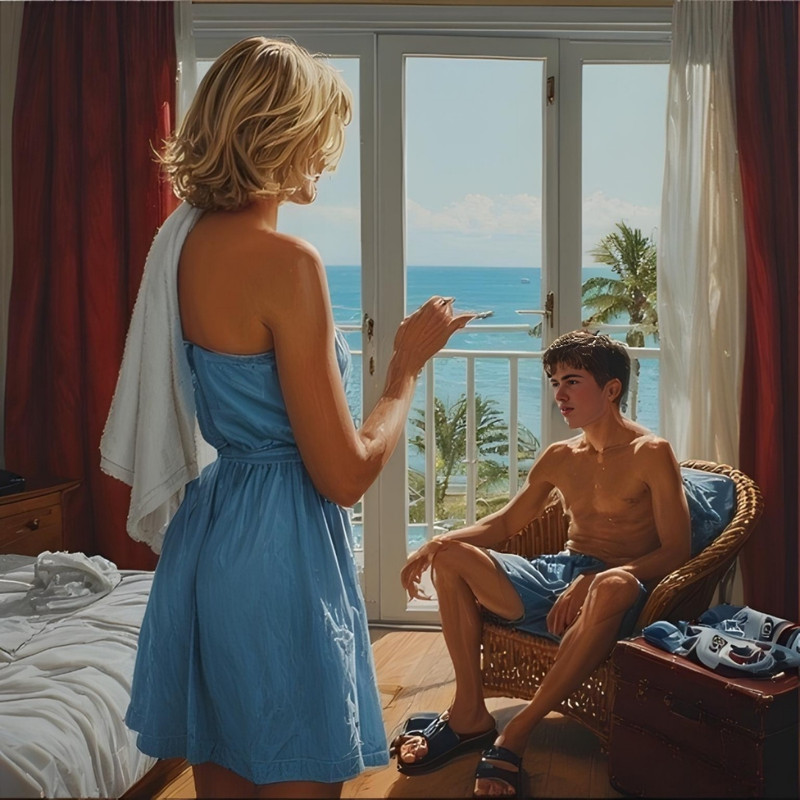 Часть 3. Глава 1. Стук захлопнувшейся двери вырвал Артёма из сонного оцепенения. Он резко открыл глаза, ещё не понимая, что происходит. Комната была залита мягким рассветным светом, пробивавшимся сквозь тонкие занавески. Взгляд метнулся к соседнему месту на кровати — пусто. «Где она?» Он приподнялся на локте, прислушиваясь к отдаляющимся шагам в коридоре. В голове пронеслось: «Неужели ушла?» Но сумка Ларисы всё ещё лежала на стуле, а на тумбочке поблёскивал её телефон. Артём вскочил, подбежал к окну и отодвинул занавеску. Внизу, на фоне розовеющего неба, мелькнула знакомая фигура. Мать шла быстрым шагом, держа в руках свёрнутое полотенце. «Купаться? В шесть утра?» Мысль показалась абсурдной — её купальник смиренно сушился на балкончике. Тело действовало само: он натянул шорты, схватил футболку и выскользнул из номера, даже не успев толком проснуться. Улицы курортного городка были пустынны. Воздух, ещё не раскалённый солнцем, пах морем и утренней свежестью. Артём держался на расстоянии, прячась за углами и пальмами. Лариса шла уверенно, будто знала дорогу. Она миновала поворот к основному пляжу и свернула на узкую тропинку, ведущую к скалам. «Куда она?» Сердце забилось чаще. Он пригнулся, пробираясь сквозь кусты, и вдруг перед ним открылся вид: крошечный, почти дикий пляж, спрятанный между скал. Песок здесь был грубее, волны — сильнее. И там, в центре этого уединённого места, стояла Лариса. Она расстелила полотенце, сняла сандалии и… замерла, глядя на море. Сначала потянулась, закинув руки за голову, и лёгкое платье приподнялось, обнажив гладкую линию живота. Потом, неспешно, она подняла руки к застёжке на шее и расстегнула платье. Тонкая ткань соскользнула с плеч, обнажив чёрное кружевное бельё. Артём замер. Её тело, освещённое первыми лучами солнца, казалось выточенным из мрамора — плавные изгибы талии, мягкая округлость бёдер, тень между грудями, подчёркнутая узором кружева. Лариса глубоко вздохнула, словно наслаждаясь свободой, и провела руками по животу, затем к спине. Пальцы скользнули к застёжке лифчика. «Не может быть… Я сплю…» Один щелчок — и чёрная ткань ослабла. Второй — бретели соскользнули с плеч. Артём почувствовал, как кровь ударила в виски. Она медленно сбросила лифчик, и её грудь, твёрдая и упругая, освободилась, слегка колыхаясь от лёгкого бриза. Соски, нежно-розовые, уже напряглись от утренней прохлады. Лариса не торопилась. Она провела ладонями по бокам, как бы проверяя себя, затем наклонилась, чтобы снять трусики. Кружевная полоска скользнула по бёдрам, оставив тело полностью обнажённым. «Я… не должен этого видеть…» Но он не мог отвести глаз. Её кожа, загорелая и гладкая, будто светилась в лучах восходящего солнца. Изгибы, обычно скрытые одеждой, теперь были открыты — мягкий изгиб талии, округлость ягодиц, тонкая тень между ног… Лариса сложила бельё на полотенце, потянулась ещё раз — и пошла к воде. Каждый её шаг отдавался в голове Артёма громом. Он, как заворожённый, не мог оторвать взгляда. Она вошла в море, и волны ласкали её бёдра, затем грудь. Лариса окунулась с головой, а когда вынырнула, откинула мокрые волосы назад, заставляя воду стекать по шее, груди, животу… Артём почувствовал жар внизу живота. «Нет, так нельзя…» Он резко развернулся и быстрым шагом пошёл назад, в отель, стараясь унять дрожь в руках. Она вернул