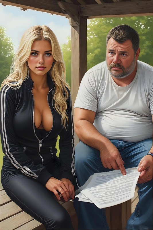 Дина всё ещё сидела на лавке в бикини. Её глаза были закрыты, а пальцы одной руки скользили под резинкой трусиков, мягко массируя влажную плоть. Она дышала учащённо, слегка прикусив губу. Подняв глаза, она встретила взгляд Виктора. Они замерли. Дина не убрала руку. Вместо этого выпрямилась и шумно дыша посмотрела на него.