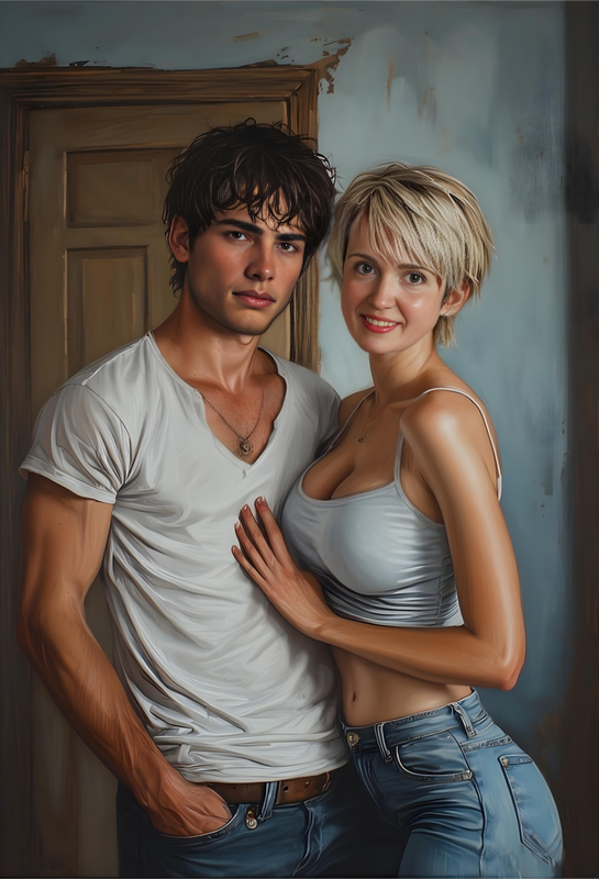 — Дима? — её голос прозвучал тихо, без удивления. — Чего не спишь? Он подошёл ближе. — Да в туалет вставал. А ты? — Пить захотелось. Она повернулась к окну снова, и Дима встал рядом. За стеклом царила осень — жёлтые листья кружились в воздухе, подхваченные ветром, асфальт блестел от недавнего дождя. Во дворе не было ни души — ни кошек, ни пьяных, ни случайных прохожих. Только одинокая собака промелькнула вдалеке, скрылась за углом. — Посмотри, как красиво, — прошептала мама. — Когда никого нет… Всё вымерло. Только листья, только тишина. Дима кивнул. В этом действительно было что-то особенное — ночь, пустота, и лишь они двое у окна. Где-то в доме напротив вспыхнул свет — то ли полуночники ещё не спали, то ли ранние пташки уже вставали. Тишина снова сгустилась. — Мам… — вдруг начал Дима, не отрывая взгляда от улицы. — Помнишь, ты задремала у нас в комнате? — Помню. — Так вот… Денис… пока ты спала… он раскрыл твой халат. Он замолчал, но мама не шелохнулась. — И оголил твои… Алина даже бровью не повела. Будто знала. — А зачем ты мне рассказал это сейчас? Дима сглотнул. — Не знаю. Просто хотел, чтобы ты знала. — Не делай так больше. — В смысле? — Ты выдал общий секрет. Твой с Денисом. — Голос её был спокоен, почти будничен. — Предателей не любит никто. Понимаешь? Он кивнул, но не отводил взгляда от окна. — Мам? — Да? — А можно мне… увидеть ещё раз? Ну… их… Алина повернулась к нему. В её глазах не было ни гнева, ни насмешки. — Если хочешь — конечно. Она замерла, будто ожидая. Дима стоял, не решаясь двинуться. — И? — наконец выдохнул он. — Что "и" ? — она слегка наклонила голову. — Ты же хочешь увидеть. Возьми и посмотри. Ты же мужчина, или как? В её голосе не было злости — лишь лёгкий вызов, почти шутливый. Дима сделал шаг вперёд. Руки его слегка дрожали, но он медленно обнял маму, нащупал застёжку лифа. Щелчок.