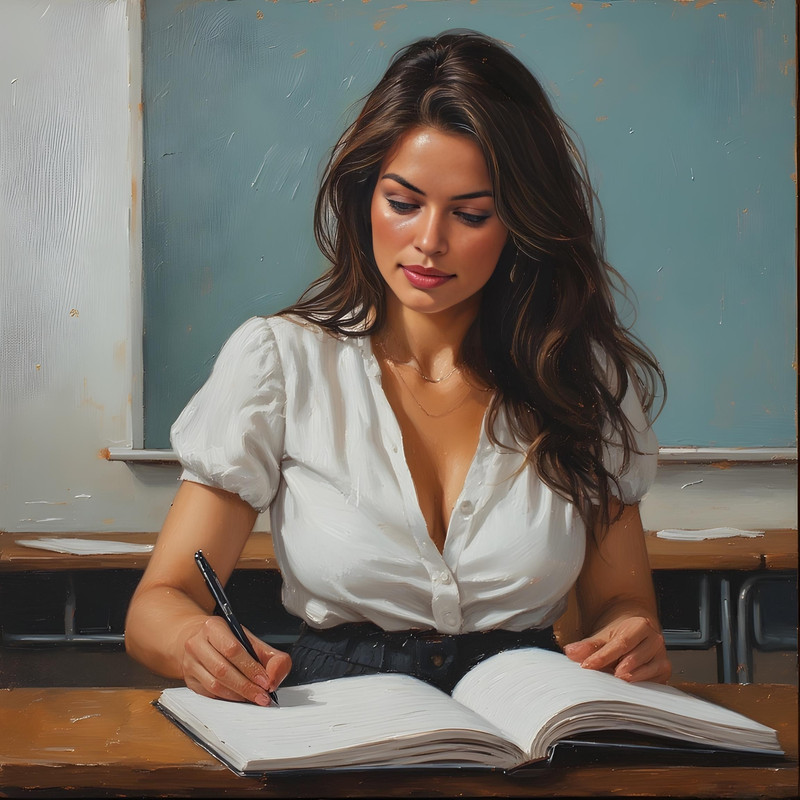 Когда они разорвались, Таня резко откинулась назад, её глаза расширились от шока. — Денис, ты совсем что ли?! — прошипела она, бросая взгляд на открытую дверь. — Дверь открыта! — Всё понял, — он отступил, ухмыляясь. — В следующий раз надо пробовать при закрытых дверях. Как скажешь! И, весело помахав рукой, выскользнул в коридор. — Дурак! — донеслось ему вслед, когда дверь уже захлопнулась. Быстро взлетев на третий этаж Денис задержался у двери, заглянув в узкую щель. Алина сидела за столом, сосредоточенно заполняя какие-то бумаги. В её позе, в том, как она поджала губы, сквозила та самая «школьная строгость» — та, что заставляла учеников пугливо втягивать плечи на уроках.