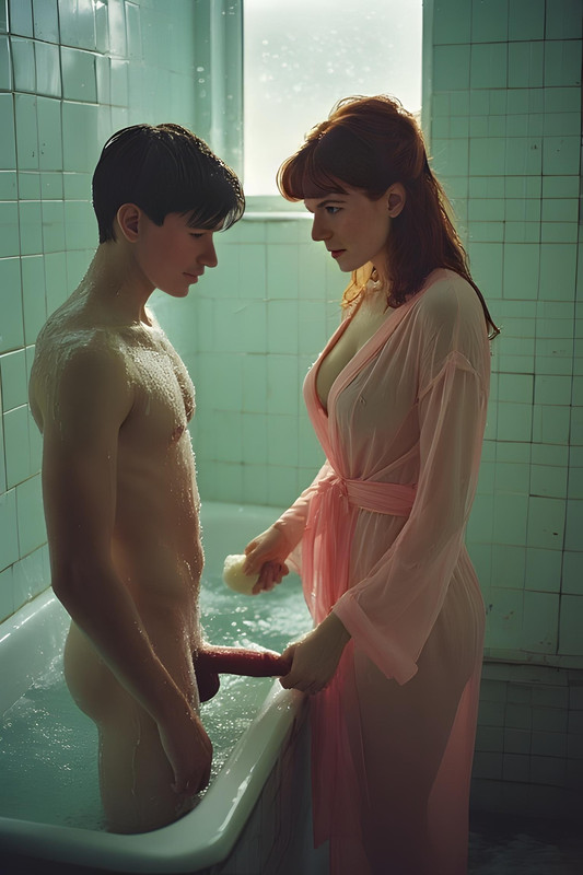 Потом Артем, когда стал гораздо старше опять долго анализировал этот инцидент. Почему она не дождалась папу с работы и не попросила помочь его, почему не сняла через голову – может лифчик был дорогой и мог порваться, почему начала снимать, не дождавшись пока он ушел. Почему не прикрывалась руками. Артему 17 лет. Он уже выглядит как взрослый парень. 31 августа он переедет в Москву в студенческое общежитие. Но пока это лето еще он дома. По воскресеньям у семьи была традиция – все поочередно мылись в ванной. До 12 лет Артему натирала спину мочалкой мама. Потом сам Артем попросил, чтобы это делал папа так как начался возраст смущения наготы перед женщиной. С 12 лет мама не видела его голым. Каждое лето они всей семьей ездили на юг. Но это лето у Артема весь год были курсы-подготовка к поступлению и экзамены, было не до путевки. Отец решил с товарищем поехать в Тунис, а дома остались Лариса и Артем. Наступило воскресенье. Артем пошел в ванну: по традиции сначала он отмокал, лежа в горячей ванной с пеной – чтобы вся грязь лучше отходила. Во время отмокания, Артем пользовался тем, что дверь в ванну плотно закрыта, все знают, что он моется и никто не войдет, и мастурбировал лежа в горячей ванной. Потом начинал натирать себя мочалкой – руки, ноги, живот, а затем обычно приоткрывал дверь и звал папу и тот тер ему спину. В этот раз Артем подумал, что скоро он будет жить без родителей в Москве, в общежитии, пора привыкать одному мыть спину, но внезапно дверь в ванну открылась и вошла мама. Ларисе было 42. Она была в бледно-розовом халате, небрежно повязанным поясом. Прическа стала еще меньше – теперь это было каре. Артем встретил маму стоя в пенной ванной, его член после недавней мастурбации был увеличенного размера. Артем испугался и прикрыл его двумя руками. — Ой да, что я там у тебя не видела – сказала, смеясь мама. Поворачивайся спиной – спину тереть будем. Артем повернулся, положил руки на стену ванной, мама взяла мочалку, намылила и начала тереть спину — Ты возмужал, совсем мужчина, в Москве отбоя от девчонок не будет – весело сказала Лариса. Артем смущенно молчал. Закончив со спиной – мама шлепнула Артема по попе и сказала: — Поворачивайся, давай я тебе плечи и грудь лучше разотру. Артем повернулся. Его член еще больше увеличился, он еще не стоял, но внушительно окреп от возбуждения. Лариса посмотрела на него, и Артем заметил, как это пишут в книгах, искру промелькнувшую в глазах мамы. Она ничего не сказала и начала мочалкой тереть грудь сыну Закончив, она взяла душ – и начала смывать пену с тела Артема, помогая рукой, начала с плеч, ладонью убирая пену, переходя на грудь, живот, а далее ее ладошка переместилась на член сына, провела по нему пару раз рукой, открыла головку и провела пальцами по основанию и направив струю душа сказала: — Тут бактерий много вредных собираются – надо тщательней подмывать. Артем смущенно молчал и не знал куда скрыться от стыда. Все действие его необычайно возбуждало. От прикосновений матери член поднялся вертикально вверх, как бывает только у подростков в самый период сексуального влечения.