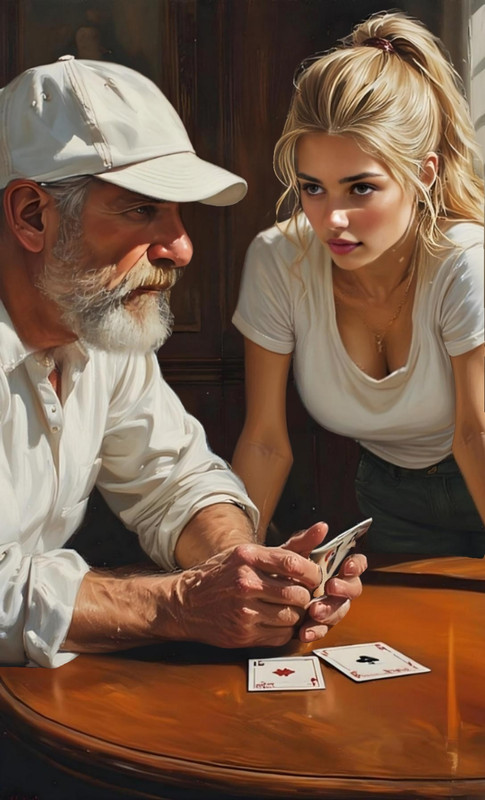 — Динка! — мягко сказал он. — Чего так быстро проскочила, ни слова не сказала?.. Как съёмки, всё нормально прошло? Она отвела взгляд, пальцы её сжали край полотенца. — Н-нормально… — вымолвила она, и голос её дрогнул. Геннадий покачал головой. — Ага, то-то на тебе лица нет. Пошли, скажу тебе кое-что… Они зашли в её комнату. Диана села на край кровати, всё ещё не решаясь взглянуть на него. — Я… я… — начала она, но Геннадий поднял руку, останавливая. — Да знаю я, — сказал он спокойно. — Ну, Дин, а чего ты хотела? Столько денег только за такие съёмки и платят. Это твой выбор был. Она открыла было рот, но передумала и не возразила. — А насчёт Игоря… — Геннадий усмехнулся. — Тут, как говорится, либо крестик сними, либо трусы надень. Поняла смысл? Диана кивнула, всё так же глядя в пол. — Ну чего ты, на меня дуться теперь будешь? На правду не обижаются… Тебя ведь никто не винит. Он присел рядом, положил руку ей на плечо. — Да за такие деньги и я бы снялся! Вот только никто не предлагает. Диана наконец подняла глаза — и вдруг рассмеялась. Смех её был лёгким, будто камень свалился с души. — Ладно, — Геннадий встал. — Перенервничала, отдыхай… К ужину приходи, покушаем, может, по телеку чего глянем. Договорились? Она кивнула, и в её глазах больше не было того напряжения, что было минуту назад. Геннадий вышел. Диана, задумчиво переваривая сказанное, снова улыбнулась и пошла сушить волосы. ***** Диана спустилась вниз, небрежно поправляя свободную футболку, и замерла на пороге. За столом, с картами в руках, сидел Дмитрич. Его пальцы ловко перебирали потрёпанную колоду, а в глазах горел тот самый огонёк — тот, что зажигается, когда человек чувствует себя в своей стихии. — Ну что, перекинемся? — спросил он, скользнув взглядом по Геннадию и остановившись на Диане. — Сика, двадцать одно, покер, дурак? Акулина, пьяница? Нет? Да во что угодно! Геннадий лишь фыркнул и отрицательно мотнул головой: — Не-е, Дмитрич, знаю я, с тобой играть — хуже, чем с зеркалом! — Ой, да хватит нюни распускать! — рассмеялся тот. — Мне просто везёт… иногда… — А давай! — неожиданно согласилась Диана. Брови Дмитрича поползли вверх.